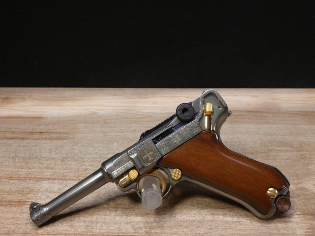 This is a American Historical Foundation Iron Cross Mauser Luger semi-automatic pistol in 9mm. Serial number- 5266. This pistol is in good condition and comes with one magazine. This limited edition pistol features beautiful detailedhand engravings with 24K gold plated accents, and is numbered 492 of only 500 produced. The Luger is marked S/42 on the toggle and 1937 above the chamber. All serial number are matching, but no serial number is present on the magazine.