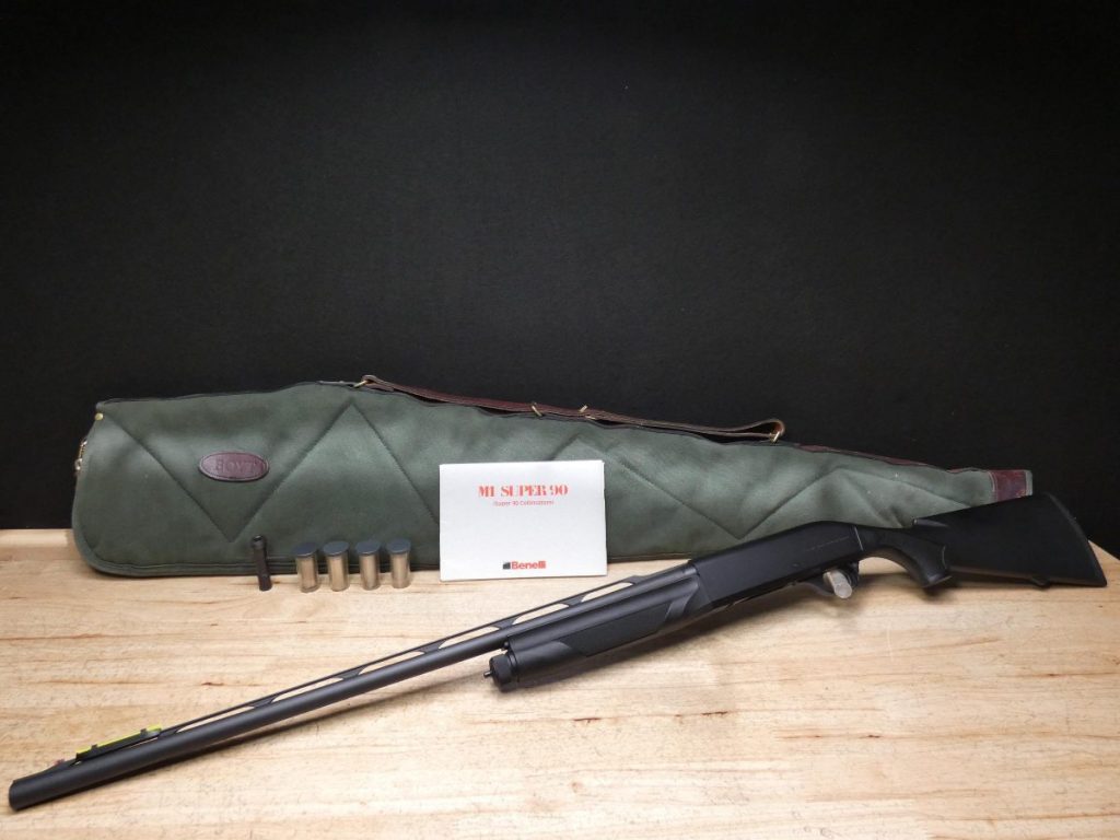 This is a Benelli M1 Super 90 semi-automatic shotgun in 20 Gauge. Serial number- N052692. This shotgun is in great condition and comes with a Boyt soft case, manual, choke wrench, shims, snap cap, oversized safety, high visibility front sight, and 5 choke tubes (F, IM, M, IC, C). Standard features include a 3" chamber, 14 1/4" length of pull, Benelli's inertia recoil operating system, alloy receiver, vent rib barrel, and black synthetic stock. The "BP" stamp leads us to believe that this shotgun was manufactured in 2001.