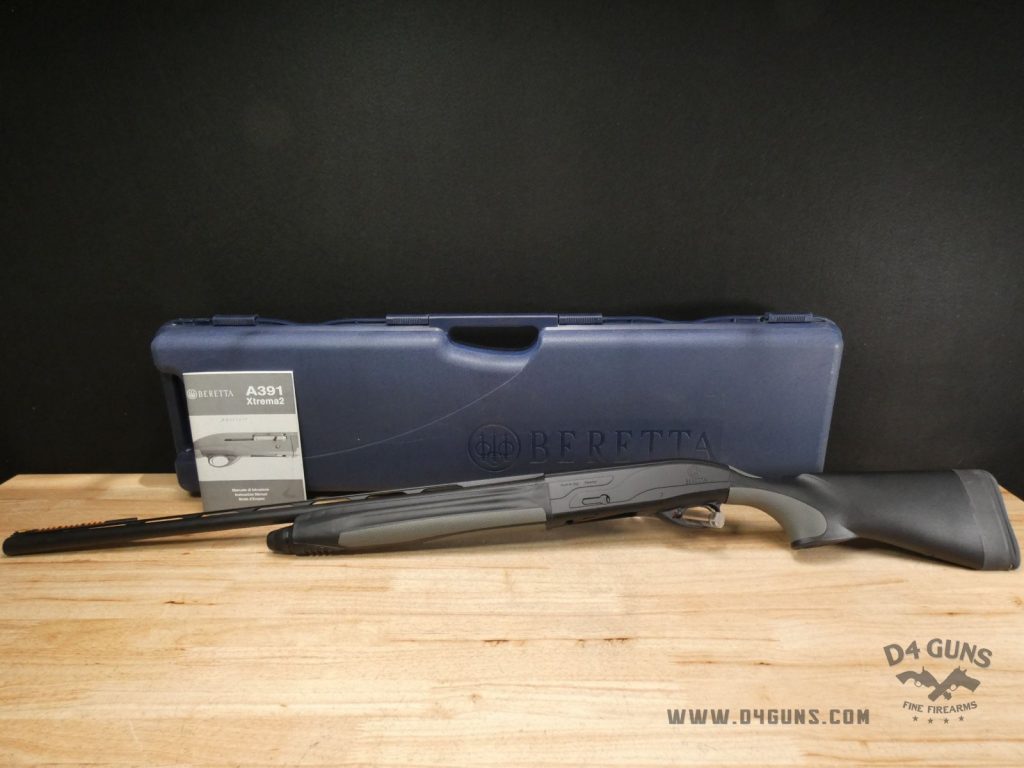 This is a Beretta A391 Extrema 2 semi-automatic shotgun in 12 gauge. Serial number- AG051555. This shotgun is in excellent condition and comes with the original hard case, and manual. Additional features include a removable improved cylinder choke tube,  a 3 1/2" chamber, and a 14" length of pull. After running a serial number lookup, we've determined this shotgun was manufactured in 2005. The buttstock-mounted recoil reducer, in combination with the optional hydraulic Kick-Off recoil pad, makes magnum shells feel like target loads.