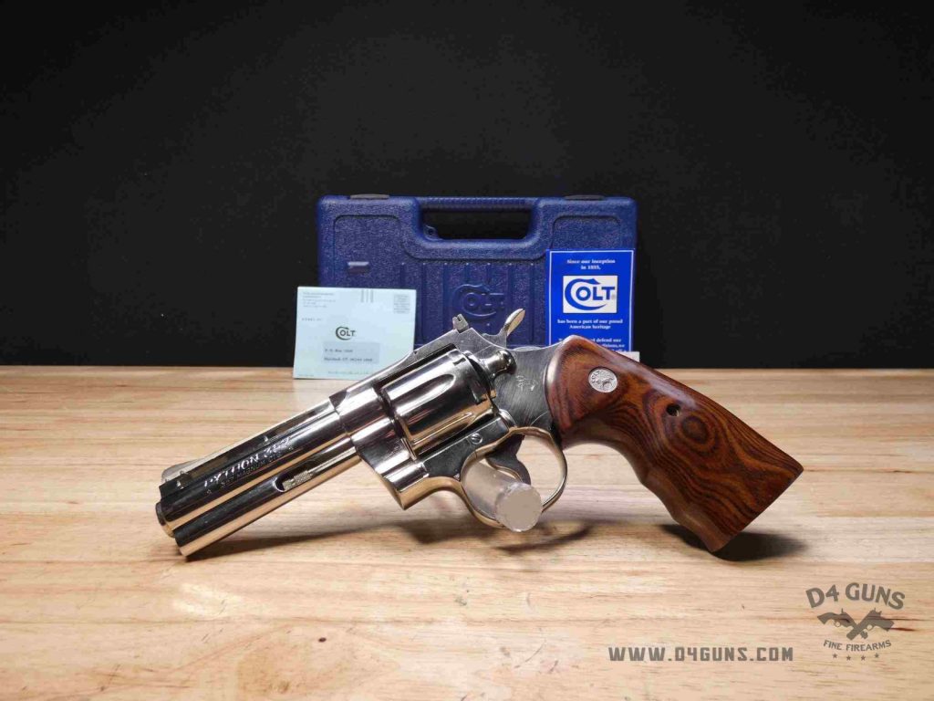 This is a Colt Python 357 revolver in .357 Mag. Serial number- E9826. This revolver was manufactured in 1970 and comes with a case (not original). This revolver looks to have been finished in nickel. The Colt Python is a .357 Magnum caliber revolver manufactured by Colt's Manufacturing Company of Hartford, Connecticut. It is sometimes referred to as a "combat magnum". It was first introduced in 1955, the same year as Smith & Wesson's M29 .44 Magnum. The Colt Python is intended for the premium revolver market segment. Some firearm collectors and writers such as Jeff Cooper, Ian V. Hogg, Chuck Hawks, Leroy Thompson, Scott Wolber, Renee Smeets, and Martin Dougherty have described the Python as "the finest production revolver ever made".