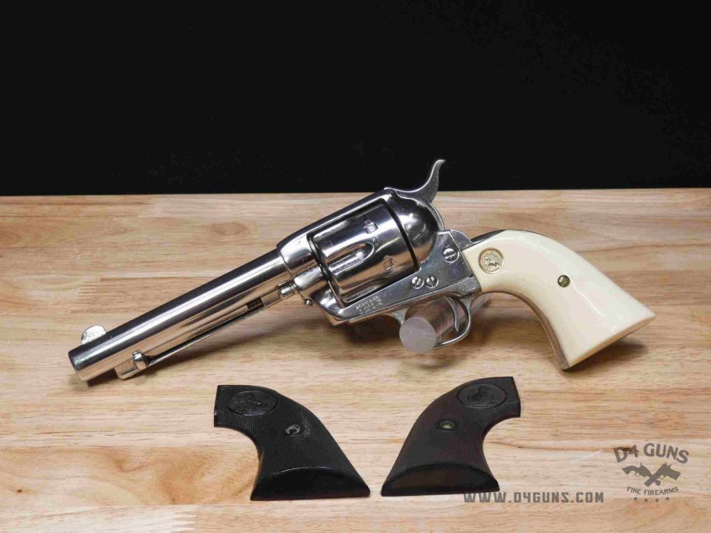 This is an all matching Colt Single Action Army revolver in .45 Colt. Serial number-70671. This nickel plated revolver comes with two sets of grips, and after running a serial number lookup, we've determined it was manufactured in 1881. It appears the firearm has been refinished as the Colt stamps on the top of the barrel are faded.