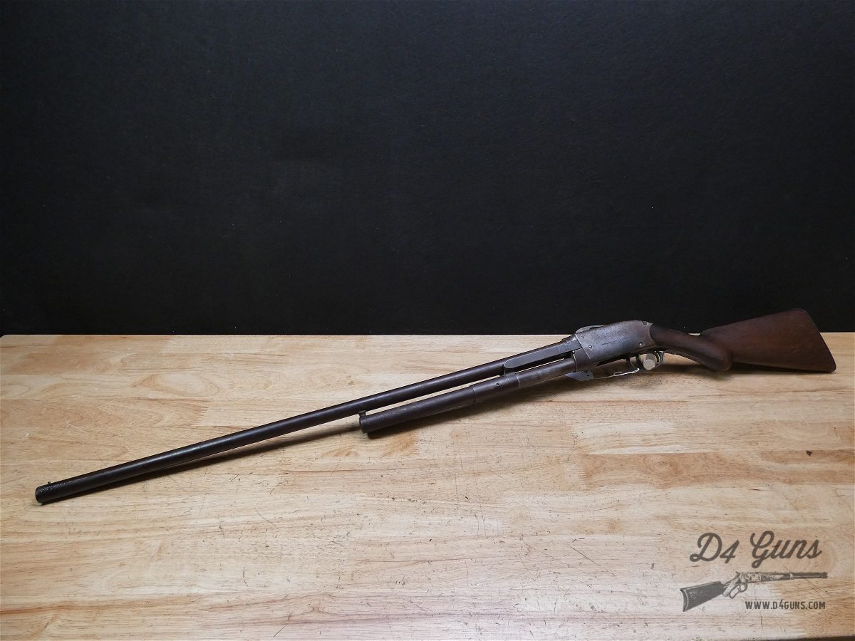 This is a no reserve penny auction for a F. Bannerman/Spencer Model 1890 slide-action shotgun in 12ga. Serial number- 8226. This Shotgun is in good condition! Francis Bannerman and his famous Catalog were a retail powerhouse at the turn of the century. Many shooters will recognize the name from his vast stores of discounted military surplus equipment and firearms. By 1890 the Spencer Sporting Arms Company was indebted to Pratt & Whitney for machinery costs and behind in payments. Spencers use a Peabody-like tilting block and feed from a tubular magazine. Loading the magazine can only be accomplished with the pump all the way back and the action open. If the shooter had not pre-loaded the chamber, he would have to pump forward, back again, and then forward once more to ready the gun. While visibly a "hammerless" gun, the Spencer does actually have an exposed hammer spur. It’s the "second trigger" at the front of the trigger guard. This is, essentially, a "tail" integral to the hammer and allows the shooter to decock the action at will. Please note the forend is missing.