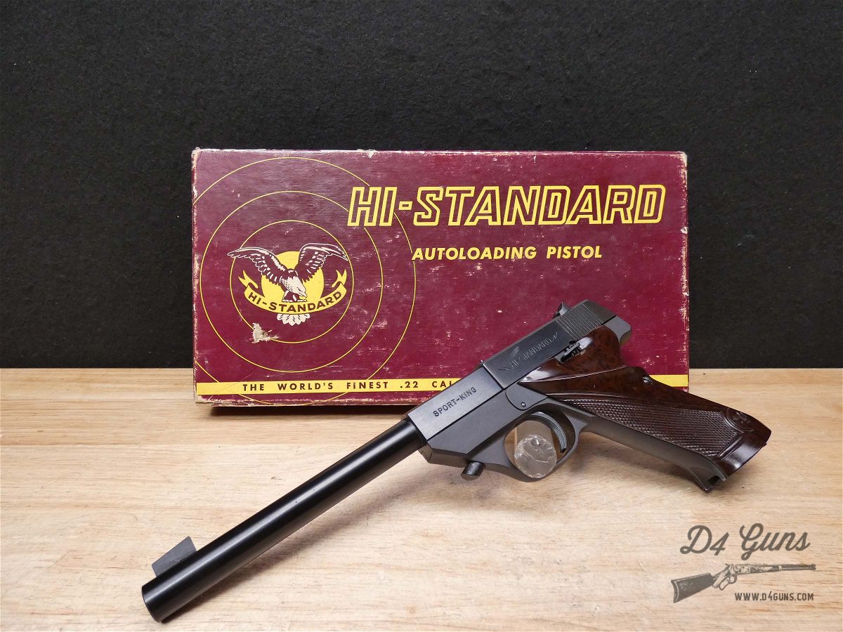 This is a no reserve penny auction for a High-Standard SK-100 Sport King semi-auto pistol in .22LR. Serial number- 511368. This pistol is in excellent condition and comes with the original box. Note it does NOT come with a magazine. The "Sport King" model was introduced as a general-purpose, low-cost model. It was originally produced in 1950. It uses the .22 L.R. cartridge, has a magazine capacity of 10, checkered plastic thumb rest grip and fixed sights. Like the other recent models, interchangeable barrels, 4 1/2 and 6 3/4 inches, were available. By 1954 it was provided with a new positive lock safety and could be had with either a steel or a forged aluminum frame. With the steel frame and 6 3/4-inch barrel the weight is 40 ounces, whereas with the aluminum frame and the same length barrel the weight is 30 ounces.