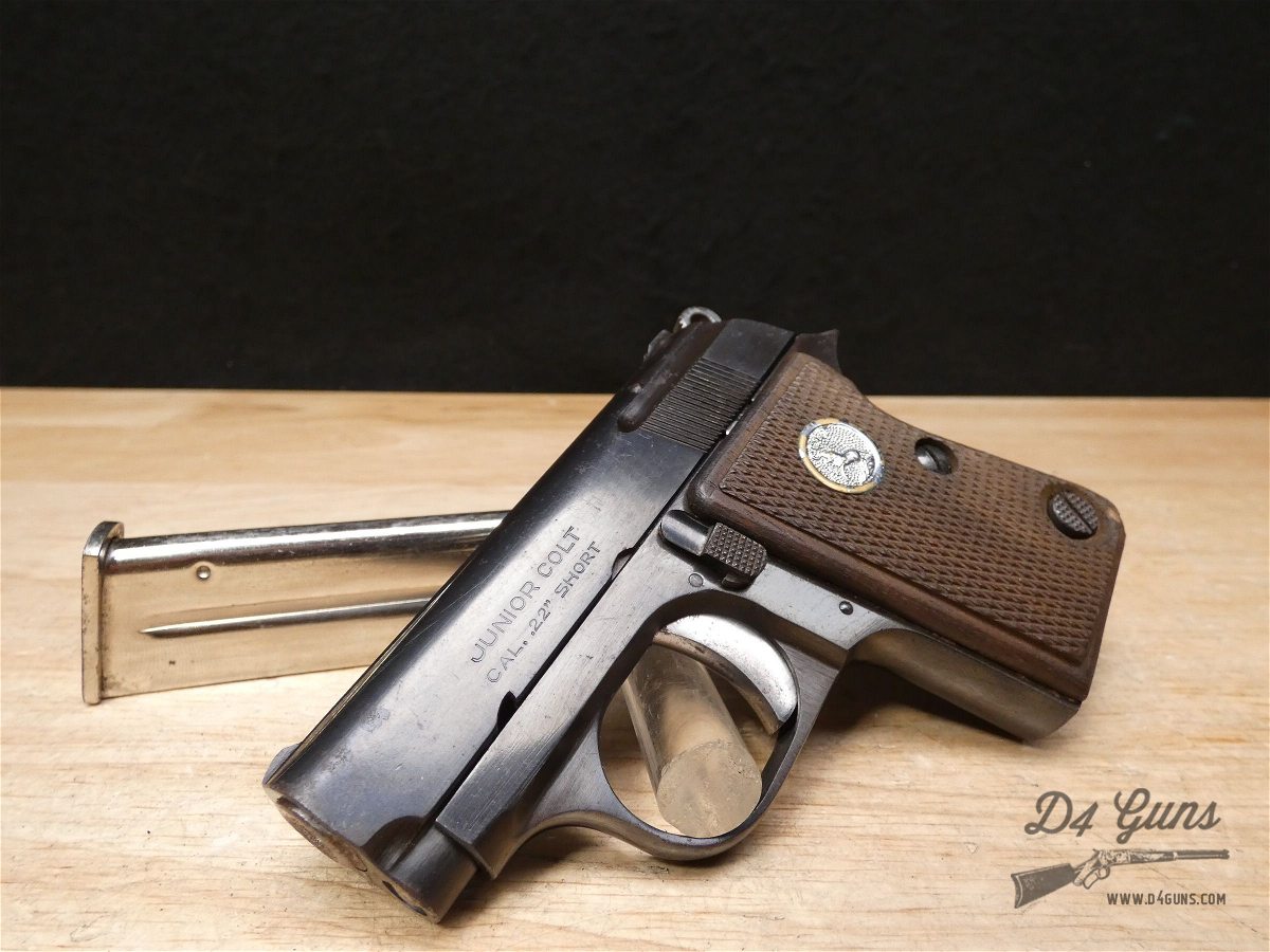 This is a no reserve penny auction for a Colt Junior Colt semi-automatic mico-pistol in .25 Short. Serial number – 14799cc. Mfg Dated: 1962. This pistol is in comes with a 7-round magazine. After WWII Colt had developed a new pocket pistol that was too expensive to manufacture. Instead, Colt turned to the Spanish firearms manufacturer Astra Unceta y Ca to produce what would become known as the Colt Junior. Please ensure that you carefully examine all of the photos provided in order to accurately assess the condition of the pistol. Note there is some rust on the slide.