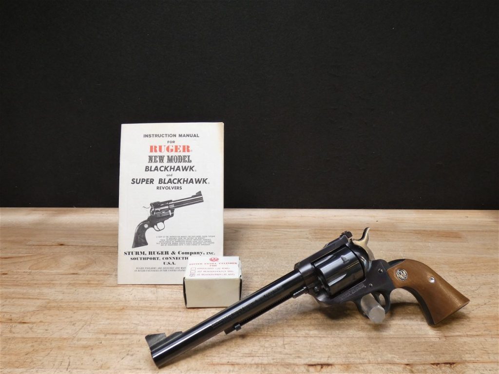 This is a Ruger New Model Blackhawk double-action revolver in .45 Colt/.45 ACP. Serial number -46-66642. After running a serial number lookup, we believe this revolver was manufactured in 1981. Includes an extra cylinder for .45 ACP rounds and the original manual. Ruger's Blackhawk revolver meets the needs of today's single-action shooters. The patented transfer bar mechanism and loading gate interlock provide an unparalleled measure of security against accidental discharge. Its cold hammer-forged barrel results in ultra-precise rifling that provides exceptional accuracy, longevity, and easy cleaning.