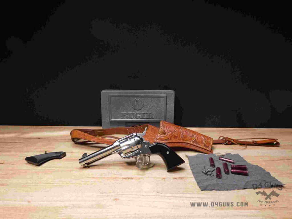 This is a Ruger New Vaquero revolver in .45 Cal. Serial number- 510-80292. This revolver comes with a case, El Paso Saddlery Co. Makers leather holster, extra grips, and six snap caps. The firearm was manufactured in 2009. Traditional western-style, hand-filling grip has long been acknowledged as one of the most comfortable and natural-pointing of any grip style. Patented reverse indexing pawl allows for easier loading and unloading, while the traditional beveled cylinder simplifies holstering. Transfer bar mechanism and loading gate interlock provide an unparalleled measure of security against accidental discharge.