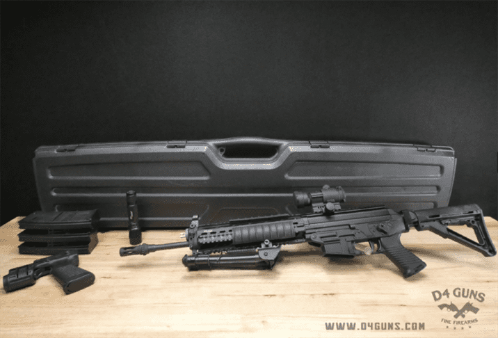 This is a Sig Sauer Sig 556 SWAT semi-automatic rifle and came with a hard case, bipod, Aimpoint PRO red dot, Magpul CTR stock, Sig STL-100 flashlight with grip-light module, and 3 magazines with a magazine coupler.